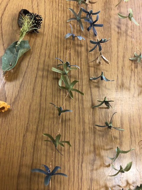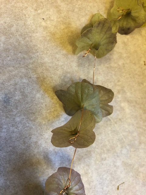 Strands of super fine copper wire is used for stringing. We would carefully poke through the flower, like using a lei needle, or wrap the plant material with the fine wire. We spaced out the flowers by making an artful twist in the wire.