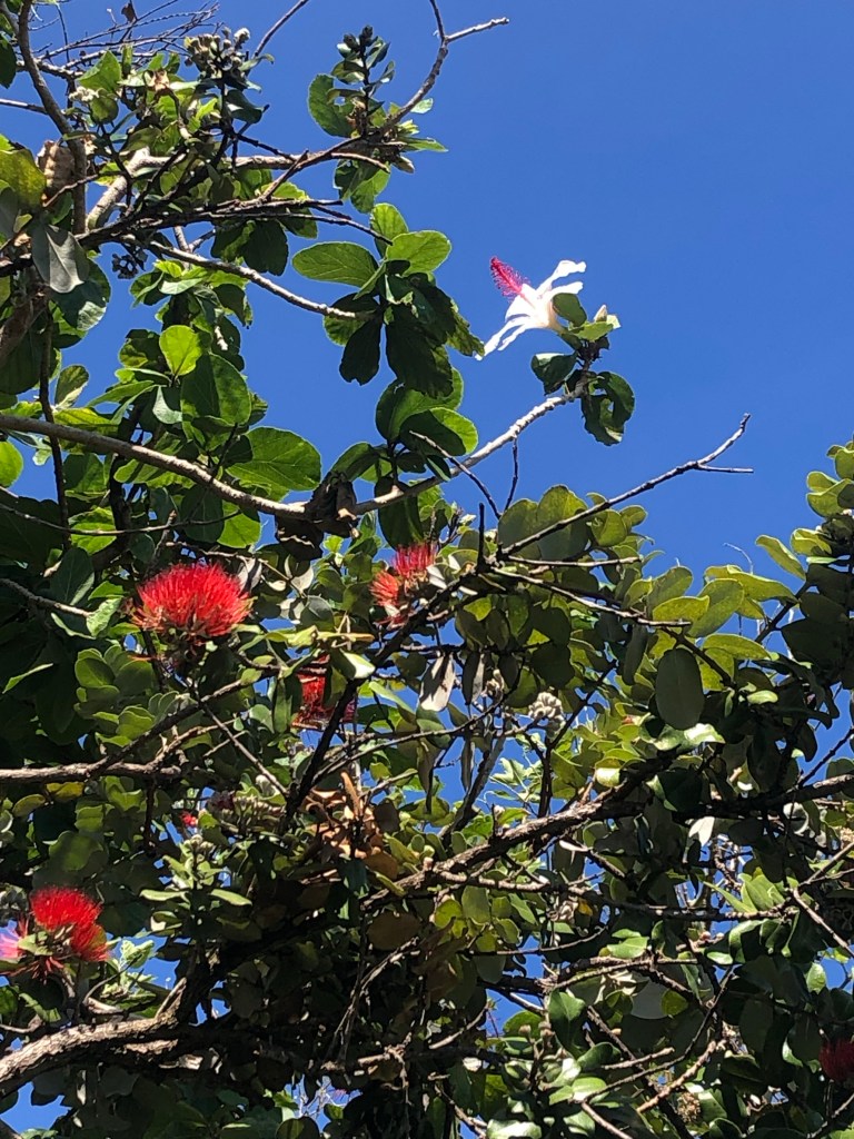 • Native White Hibiscus wind whipped leaves, a few blooms at the very top of the tree