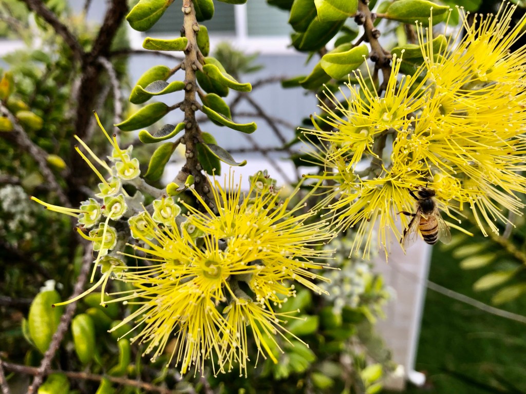 • Pua Keni keni usually Bloom less in winter, BUT after the storm mine are full of Buds, flowers and lots of developing green “ball” fruit. I made some lei for a fundraiser, and plucked and cut off all the young fruit, to encourage more blooms from the tree